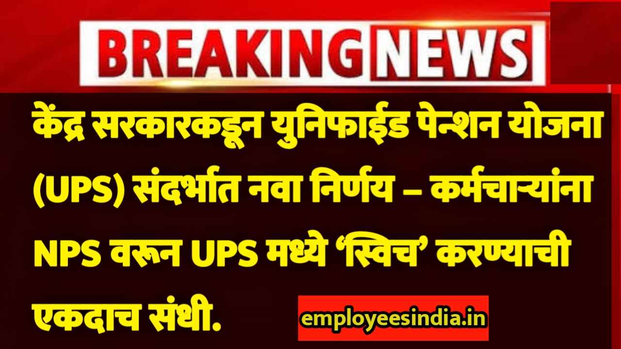 केंद्र सरकारकडून युनिफाईड पेन्शन योजना (UPS) संदर्भात नवा निर्णय – कर्मचाऱ्यांना NPS वरून UPS मध्ये ‘स्विच’ करण्याची एकदाच संधी.