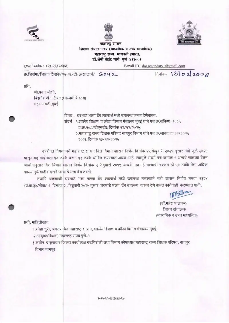 Maharashtra HRA Arrears News : नमस्कार मित्रानो राज्यातील माध्यमिक व उच्च माध्यमिक शिक्षक व कर्मचाऱ्यांसाठी अत्यंत महत्त्वाची बातमी समोर आली आहे. शिक्षण संचालनालय (माध्यमिक व उच्च माध्यमिक) यांच्या मार्फत दि. 13 फेब्रुवारी 2026 रोजी श्री. पवन जोशी, बिझनेस ॲनालिस्ट (शालार्थ सिस्टम), महाआयटी, मुंबई यांनी घरभाडे भत्ता (HRA) फरक अदा करण्याबाबत महत्त्वपूर्ण परिपत्रक जारी केले आहे.