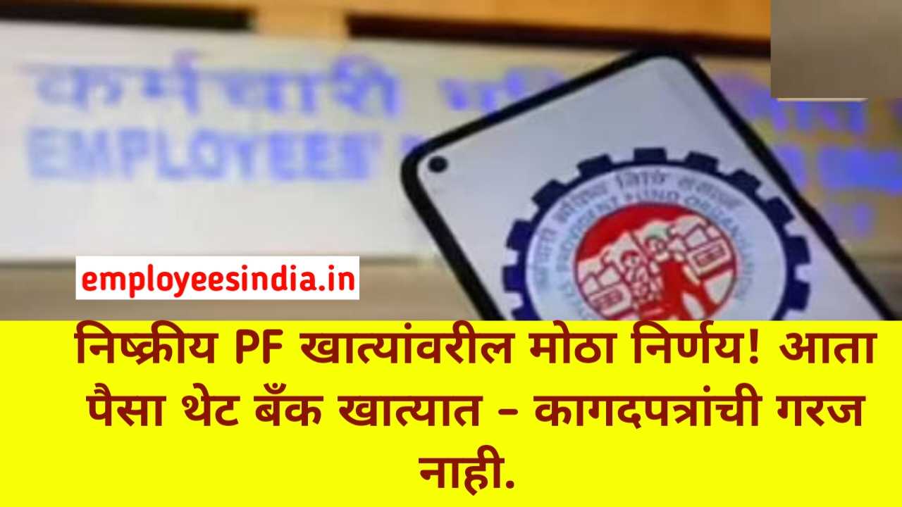 EPFO latest news : कर्मचारी वर्गासाठी मोठा दिलासा देणारी बातमी समोर आली आहे. (EPFO) च्या लाखो खातेधारकांसाठी श्रम मंत्रालयाने महत्त्वपूर्ण निर्णय घेतला आहे. या नव्या योजनेनुसार, बंद पडलेल्या किंवा निष्क्रीय खात्यांतील रक्कम कोणतीही कागदी प्रक्रिया न करता थेट संबंधितांच्या बँक खात्यात जमा केली जाणार आहे. हे वृत्त यांनी दिले आहे.
