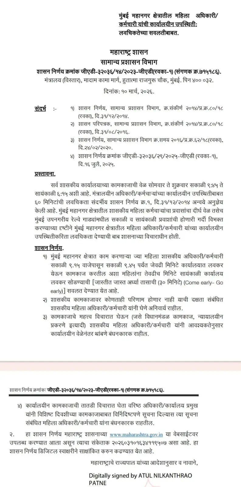याशिवाय, कार्यालयीन कामकाजाची तातडी लक्षात घेऊन वरिष्ठ अधिकारी किंवा कार्यालय प्रमुखांनी एखाद्या विशिष्ट दिवशी विशेष सूचना दिल्यास, त्या सूचनांचे पालन संबंधित महिला अधिकारी किंवा कर्मचाऱ्यांना करणे बंधनकारक राहणार आहे.