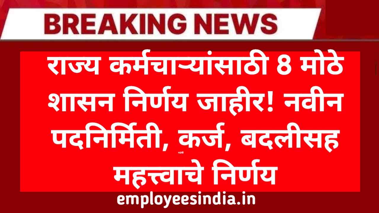राज्य कर्मचाऱ्यांसाठी 8 मोठे शासन निर्णय जाहीर! नवीन पदनिर्मिती, कर्ज, बदलीसह महत्त्वाचे निर्णय. Maharashtra GR update today
